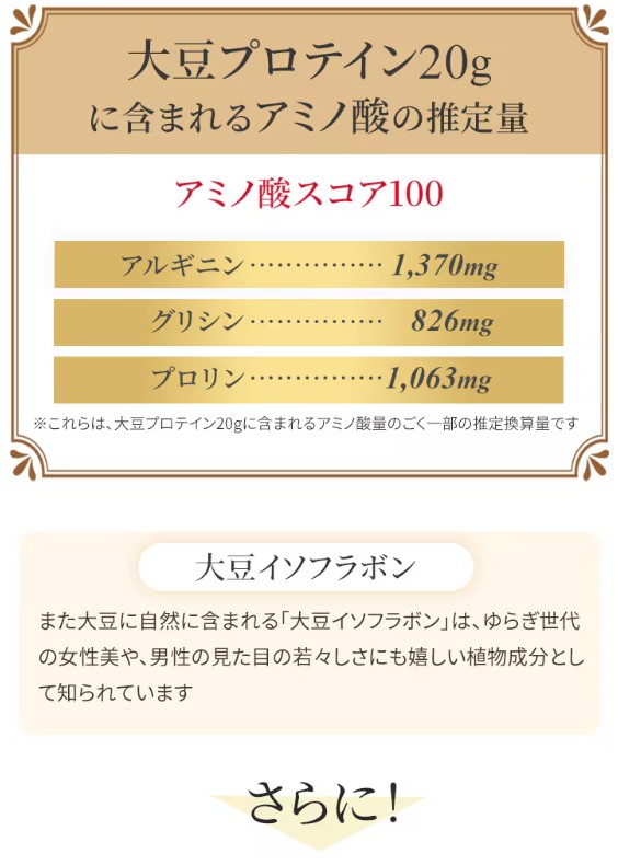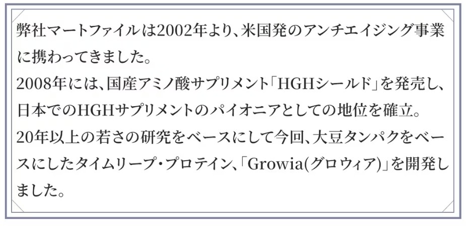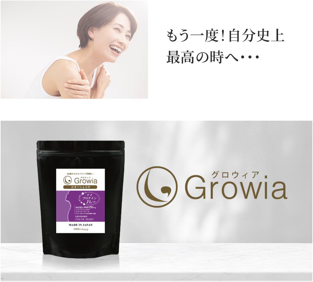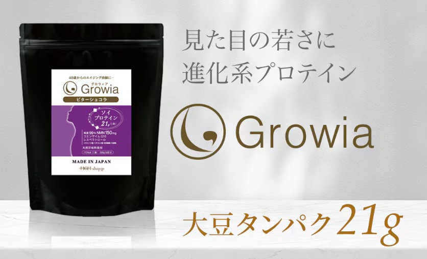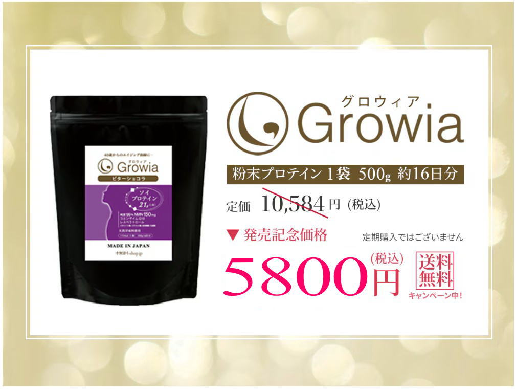| さまざまな栄養素の中でもタンパク質は、ご存知のように肌、髪の毛、筋肉といった人の見た目に大きく影響し老化に深く関わるホルモンや、コラーゲン、エラスチン、血液、皮膚、爪、髪、内蔵や酵素、抗体、神経伝達物質にいたるまで美容や健康、そして若さに深く関与しています。 しかし、お米(糖質)を主食とする日本人は、元々欧米人に比較してタンパク質の摂取量が少ないうえに近年のダイエット・ブームなどで一昔まえよりも、むしろタンパク質の摂取が減っているとさえ言われています。 Growia(グロウィア)には、大豆由来の植物プロテインを、1回分に「21g」を配合。 特に40代、50代、60代以上の方々にお勧めのプロテインです。 |