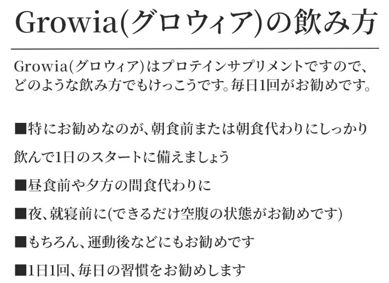 【Q. Growia(グロウィア)は、いつ飲むのですか?】 |