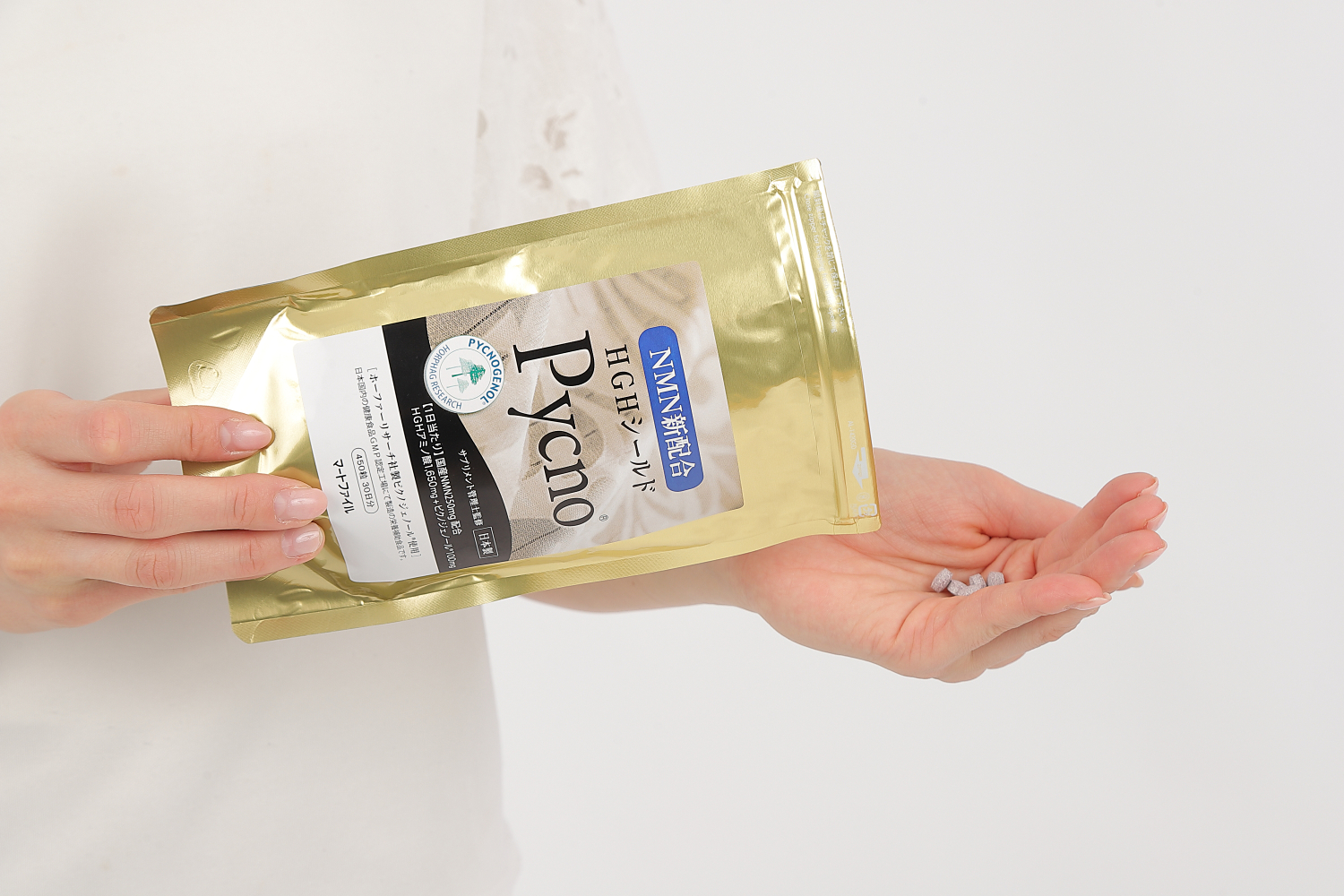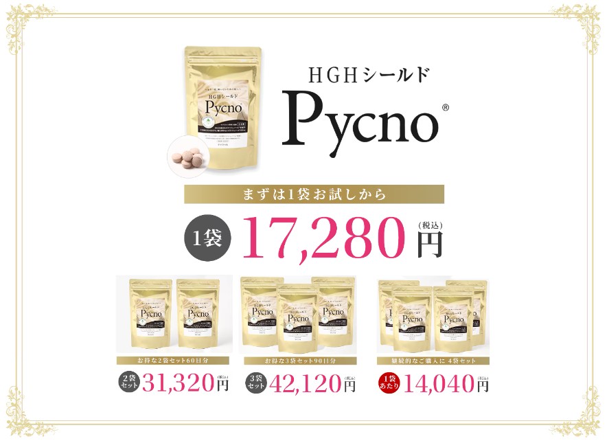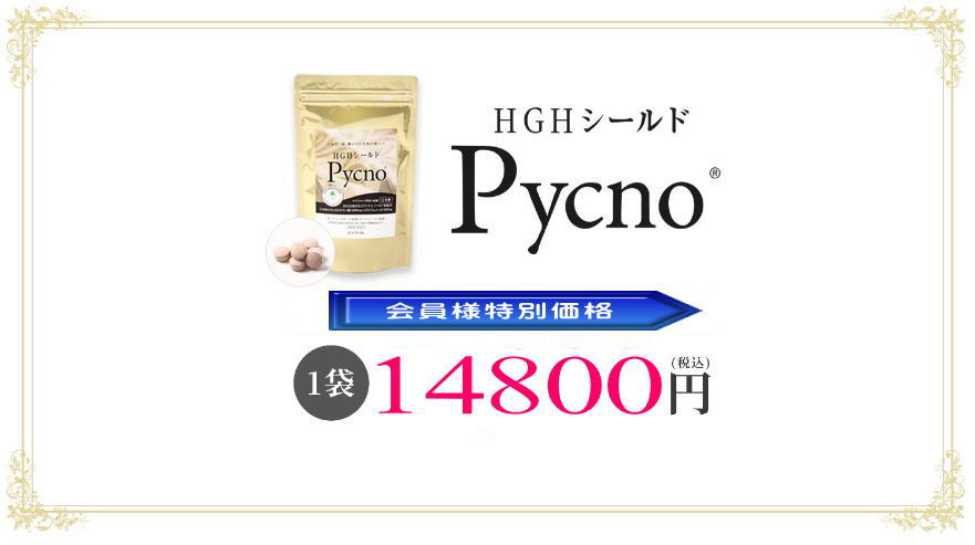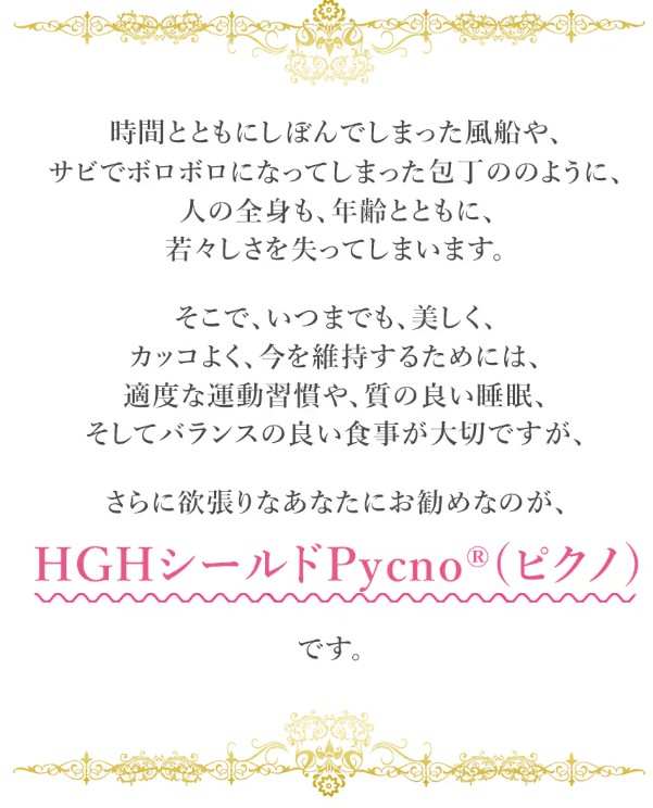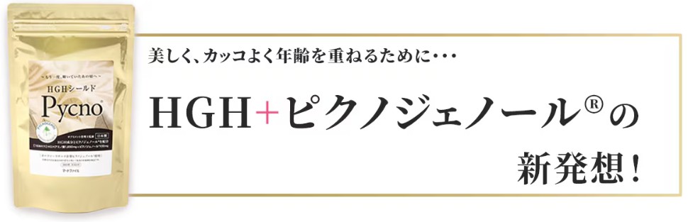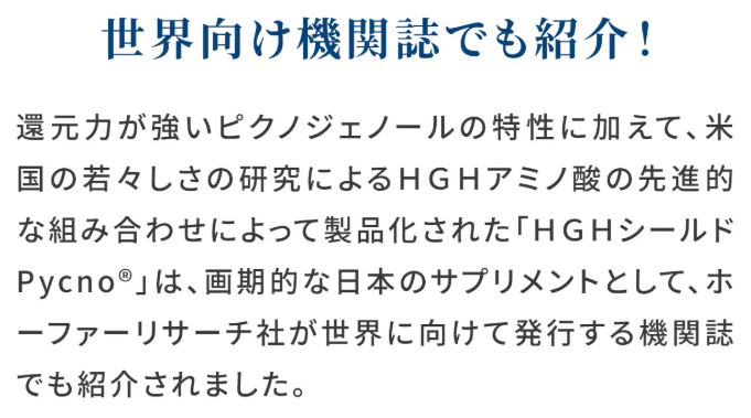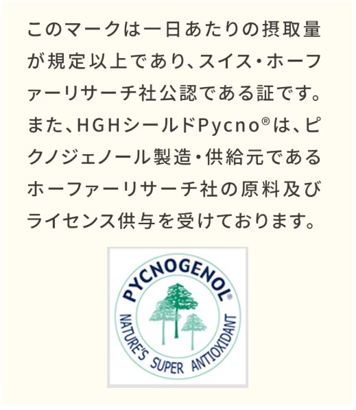 HGHシールドPycno®には、10年以上の独自の研究から生まれた配合に基づく「HGHアミノ酸」をはじめ、スイスのホーファーリサーチ社製の天然の特許成分である「ピクノジェーノール®」、ビタミンC、ビタミンE、ビタミンB群などの他、栄養機能食品の「亜鉛」などをベストバランスで詰め込んでおります。 |